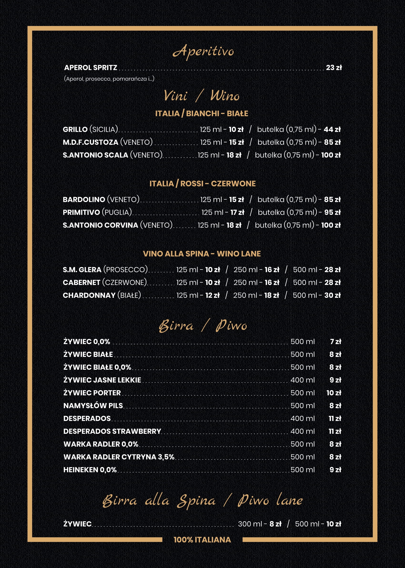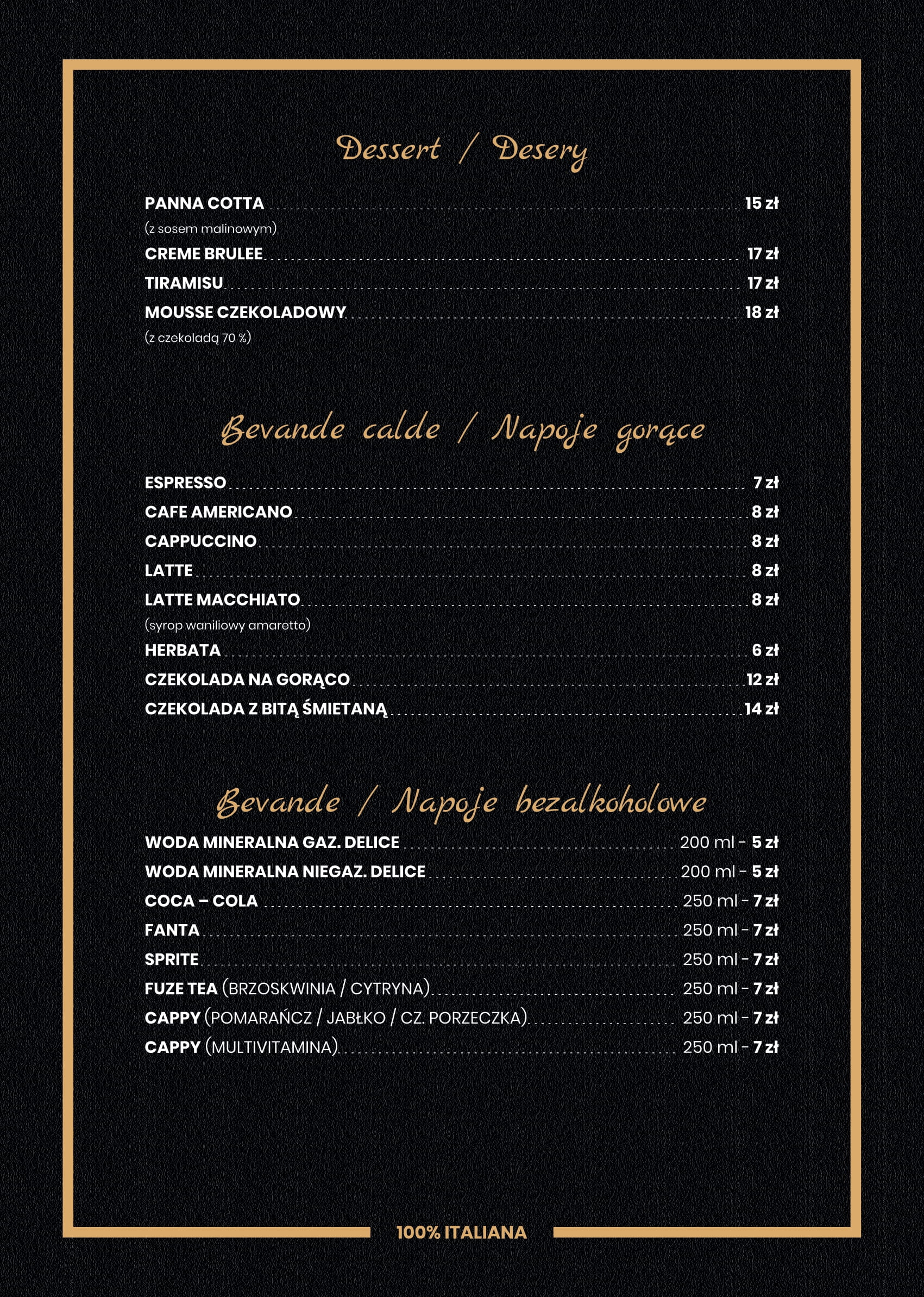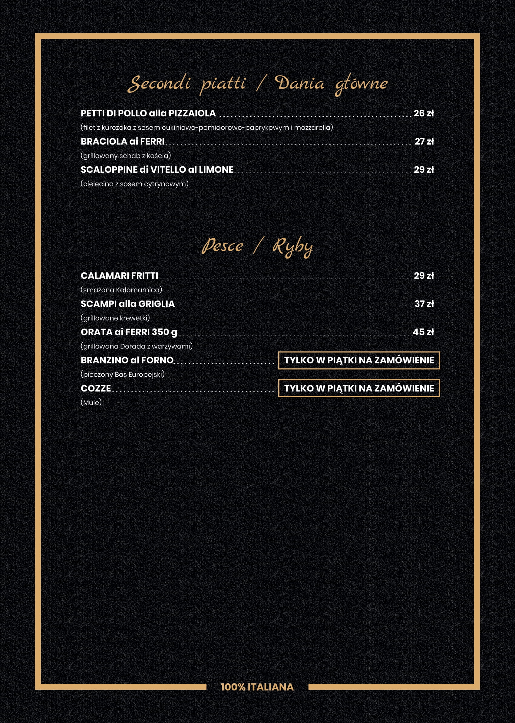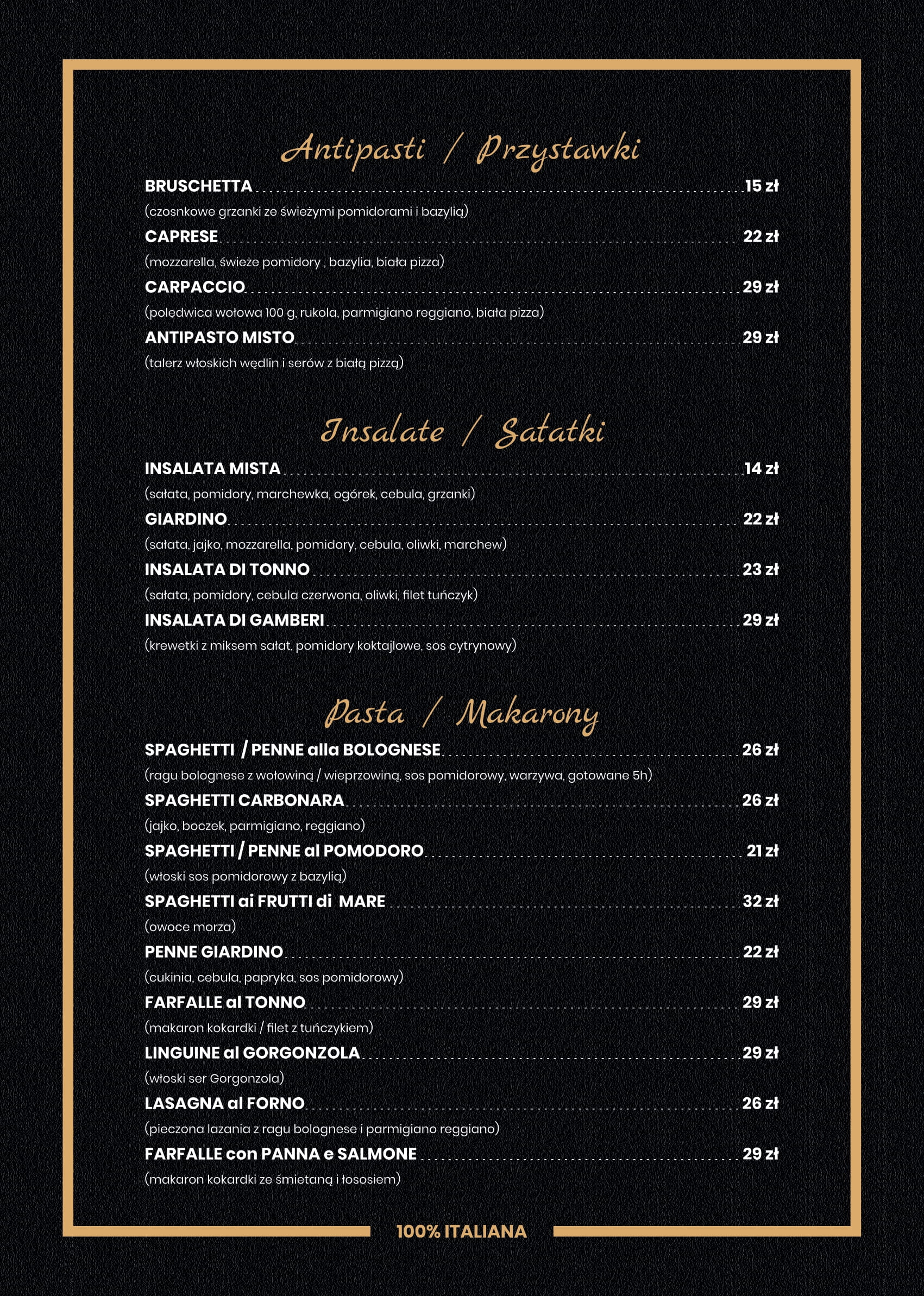 Lokal serwuje kuchnię włoską z makaronami, przystawkami i pysznymi deserami. Oczywiście nie brakuje również prawdziwej włoskiej pizzy, która swym unikalnym aromatem skusi każdego miłośnika włoskiej kuchni i nie tylko.