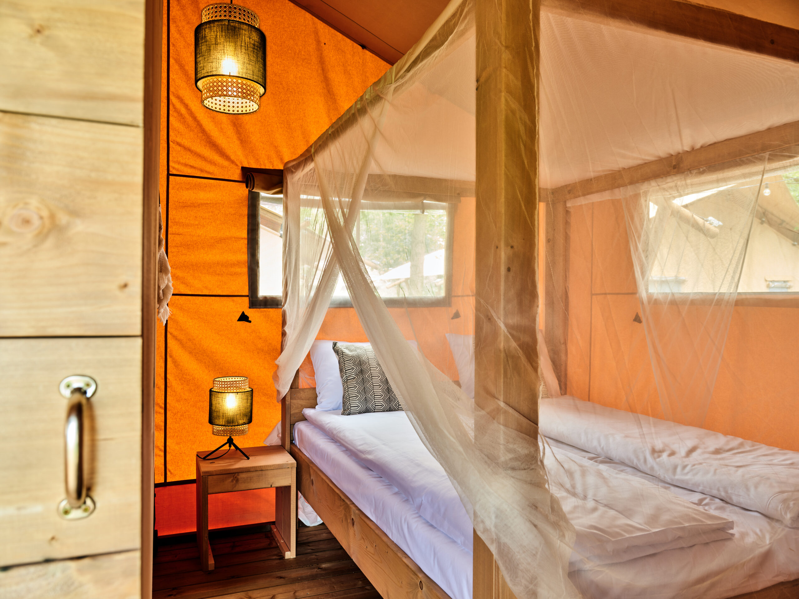 Każdy apartament wyposażony jest w część sypialną z łóżkiem typu King-Size Bed, komfortową łazienkę, w pełni wyposażonym aneksem kuchennym oraz część jadalną. Podróżujący z rodziną lub w grupie znajdą także dodatkowe łóżko piętrowe. Każdy apartament posiada zadaszony taras o powierzchni 16m2, na którym można wygodnie degustować aromatyczną kawę czy wsłuchiwać się w odgłosy otaczającej przyrody. Część namiotów posiada widok na sąsiadujący staw. W trosce o bezpieczeństwo cennych przedmiotów w każdym namiocie znajduje się sejf. Wszystkie apartamenty namiotowe urządzone są w modnym, delikatnym stylu boho, który idealnie współgra z otaczającą Zatorię naturą.